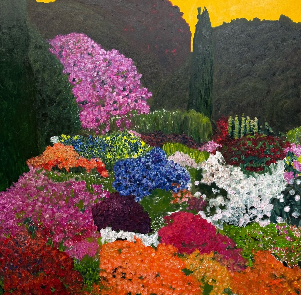 In these paintings the garden becomes a portrait, not of a place, but of a condition. It is a field of human intention, cultivated and composed, where desire presses against the untameable. The garden, like the psyche, carries both light and shadow: a site of order and obsession, of beauty built upon what it seeks to conceal. Each bush, each bloom, each chromatic decision is a negotiation with entropy, a conversation between control and its inevitable undoing.