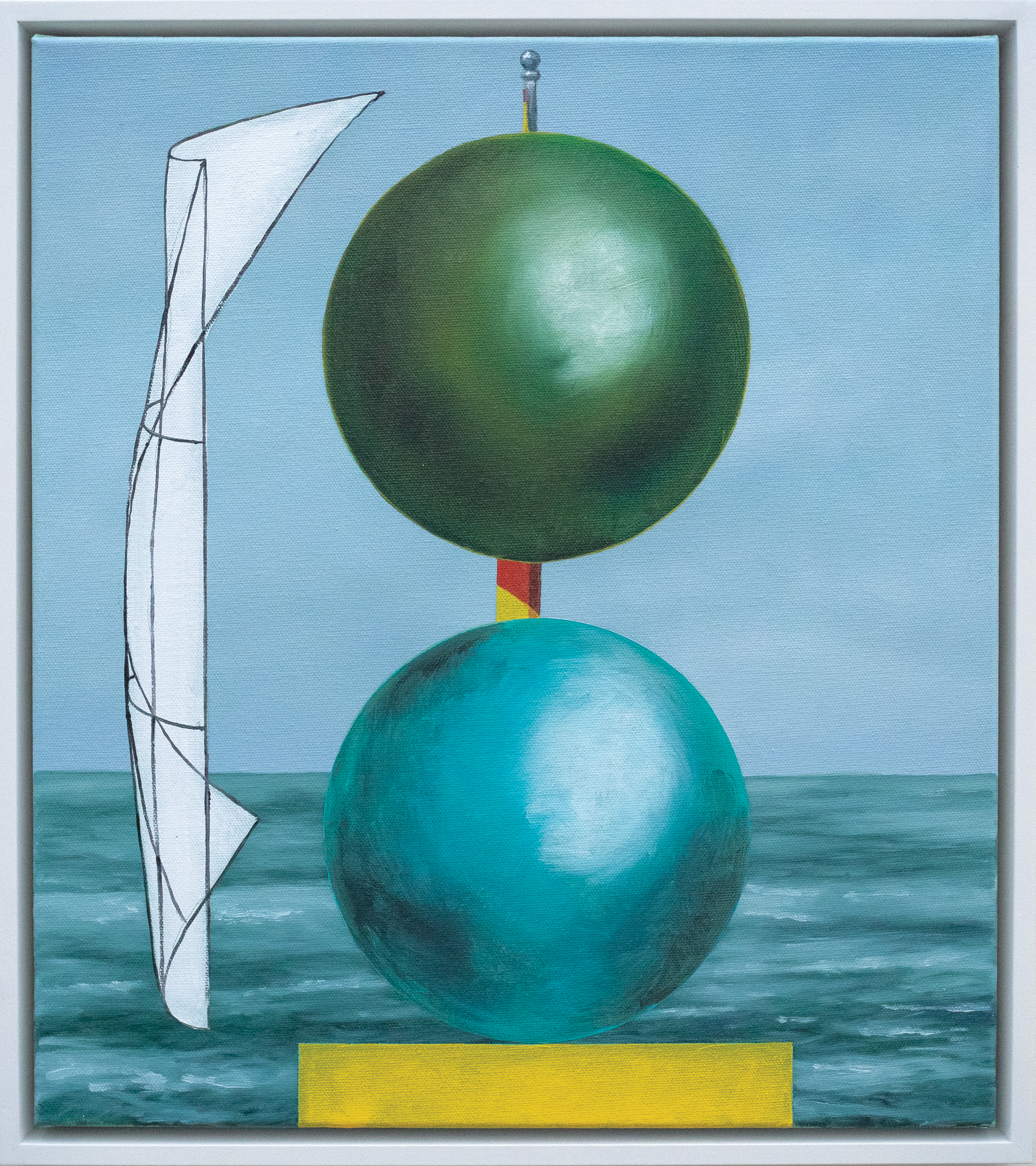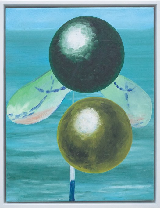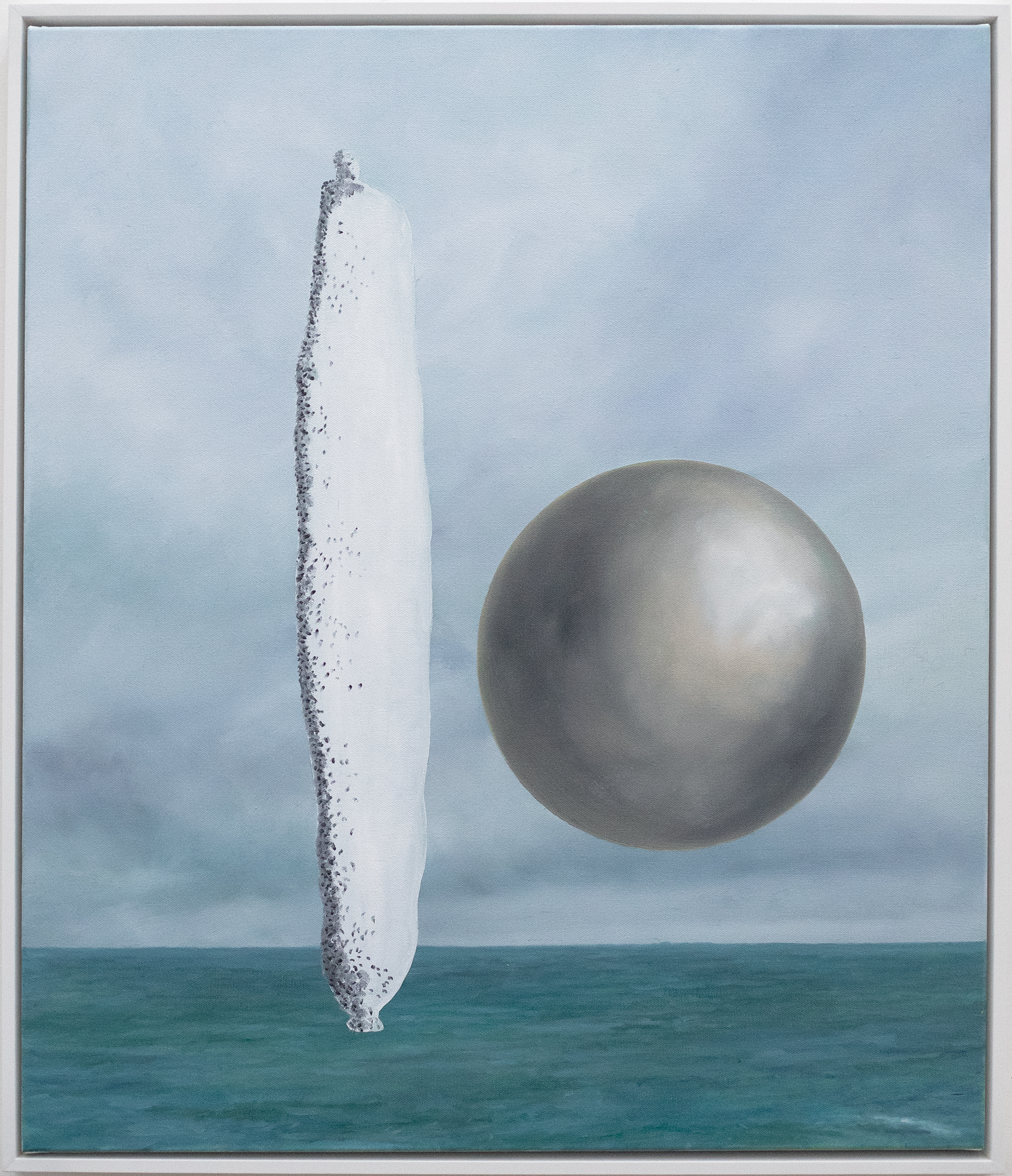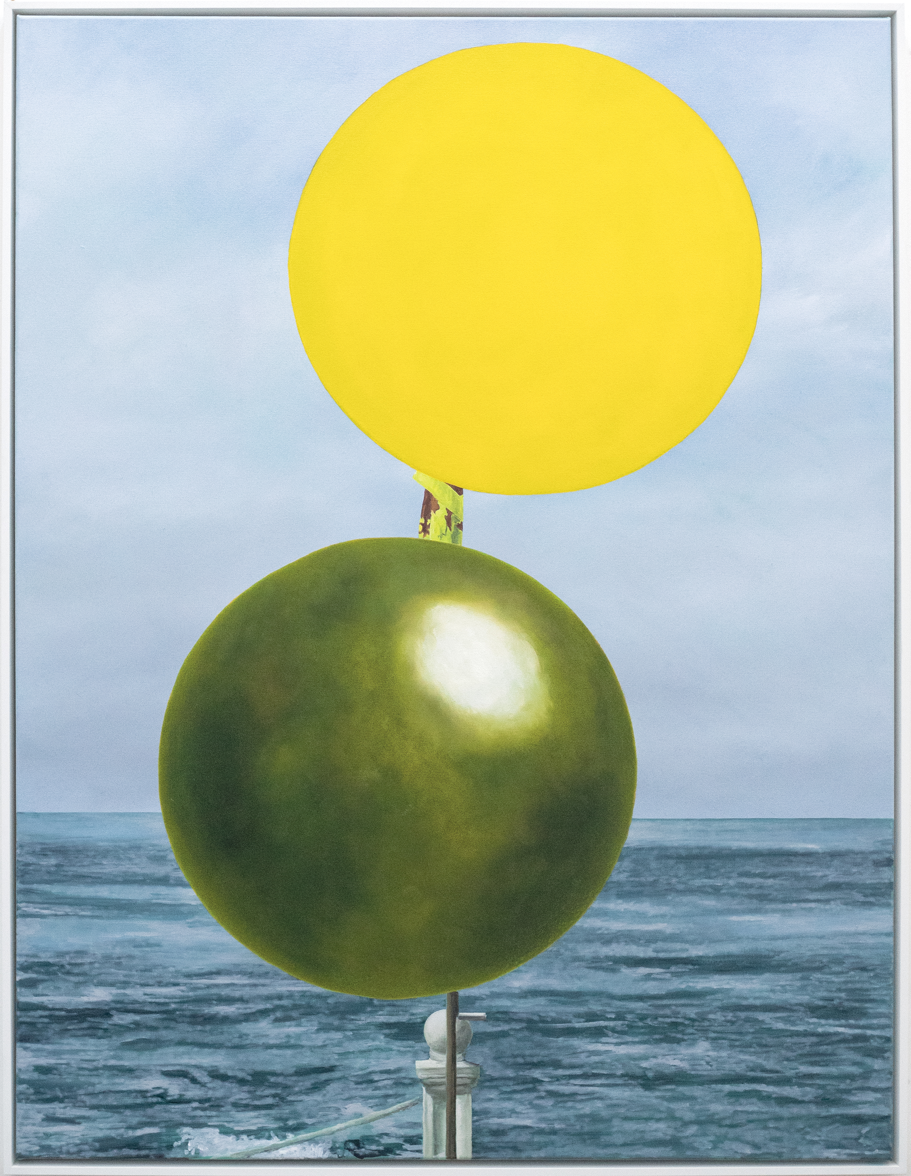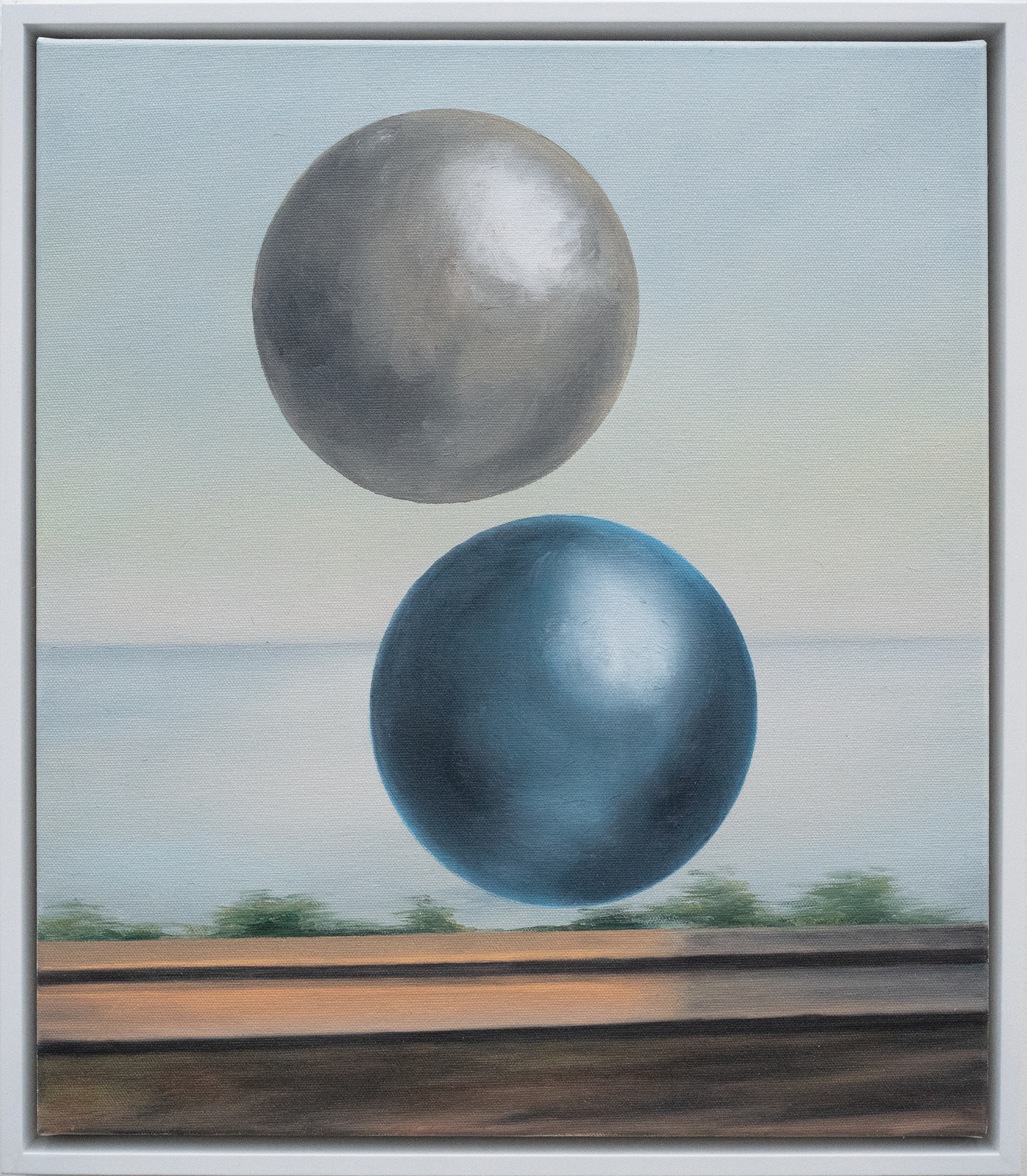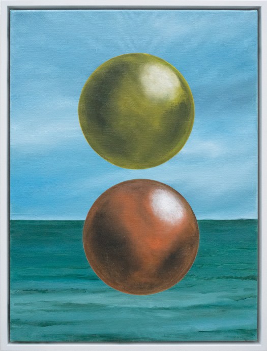 To put this into context, painting today communicates in ways that adopts and co-opts historical motif and trope, reusing and utilising symbolic references to disrupt the iconographic programmes that have served paintings dominance as a meaning carrier in the premodern years. It is here where this body of work sits, drawing on traditional modes of making, embedded in the landscape genre, a sublime coastline, a kind of beauty that acts as a stage support for a selected collection of objects and spheres, suspended but in focus, disruptive in their playfulness, seriously proposing an ambiguity and unpredictability of meaning.