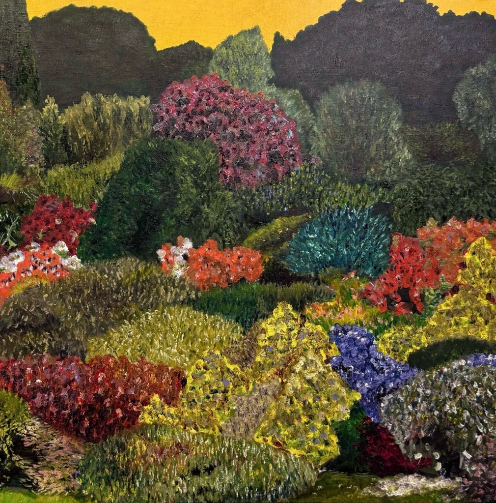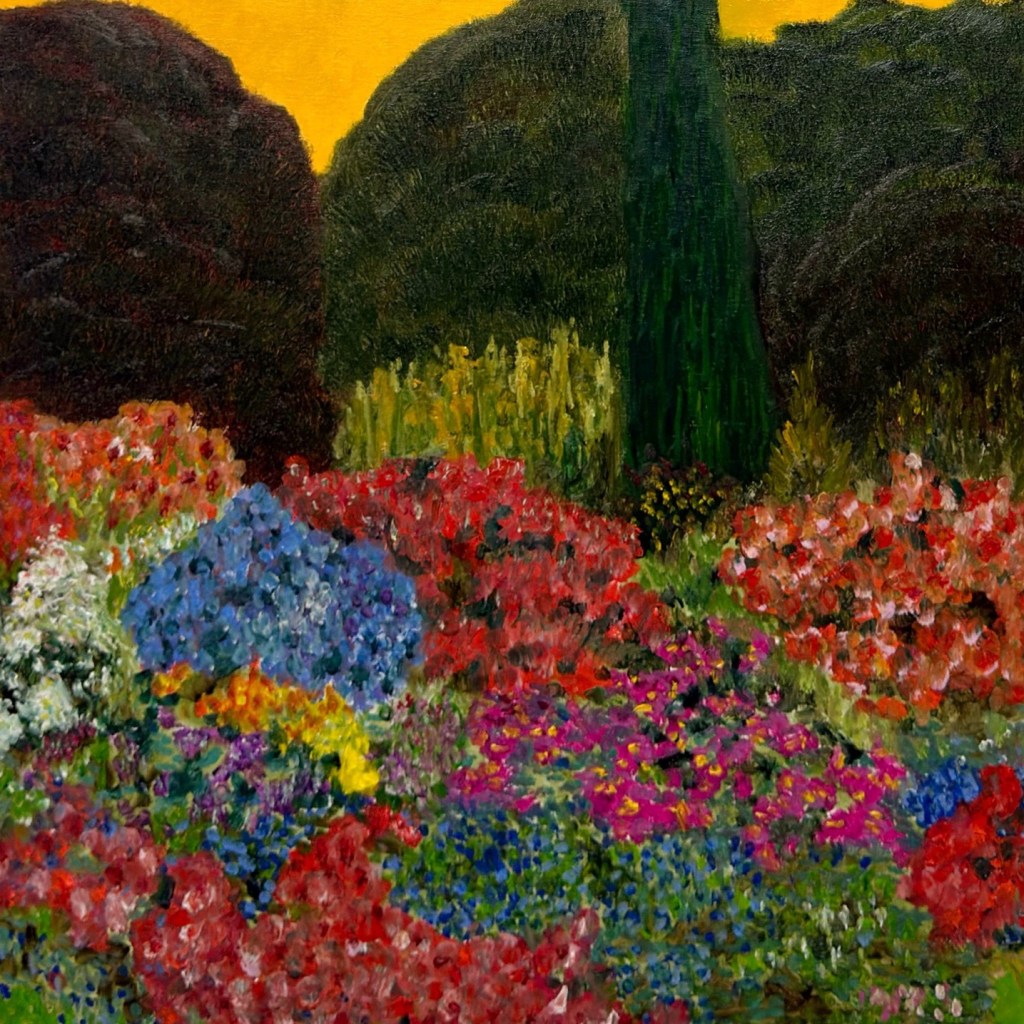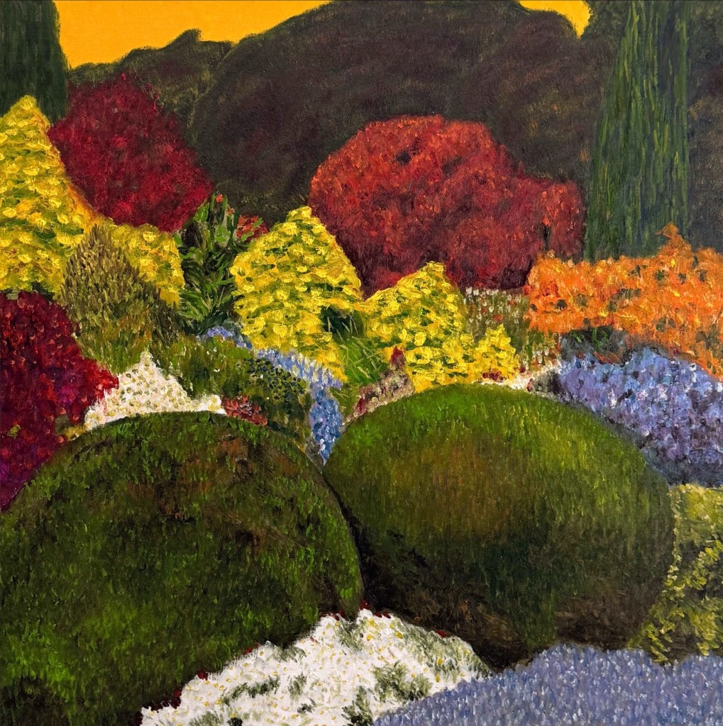The garden here becomes a mask: a surface of cultivated calm concealing the pulse of disorder beneath. Each brushstroke rehearses this tension, the desire to compose, the acceptance of collapse. Form gathers, disperses, gathers again.